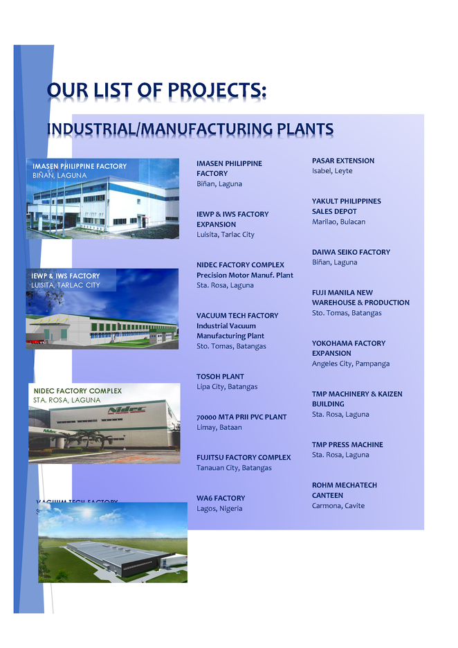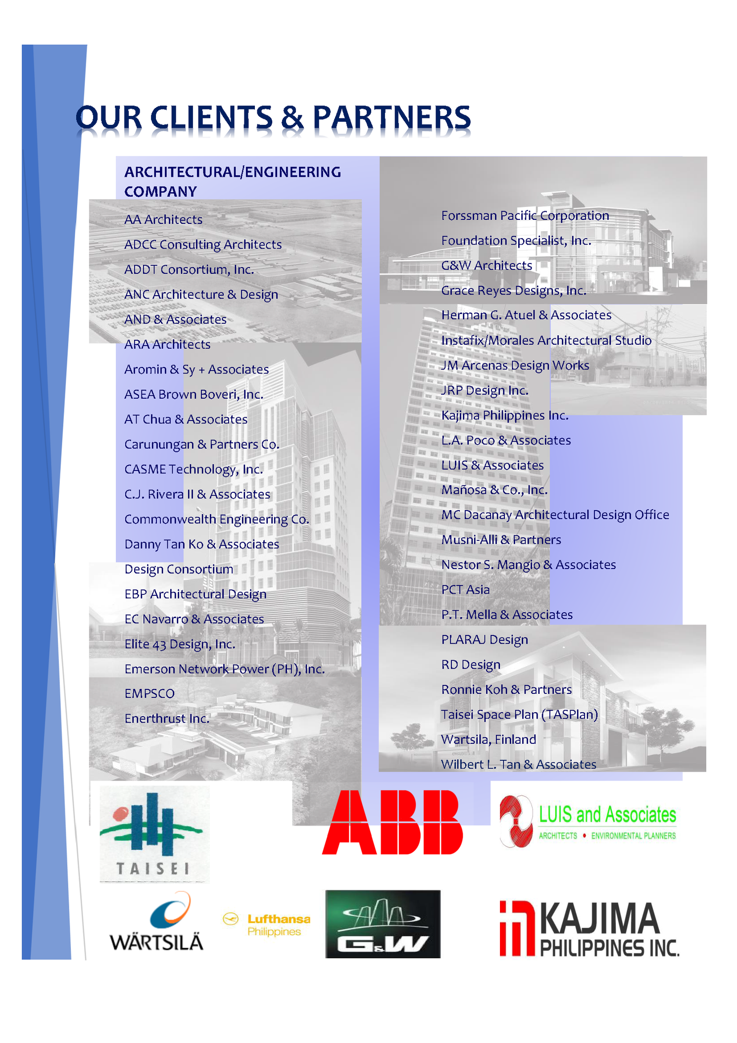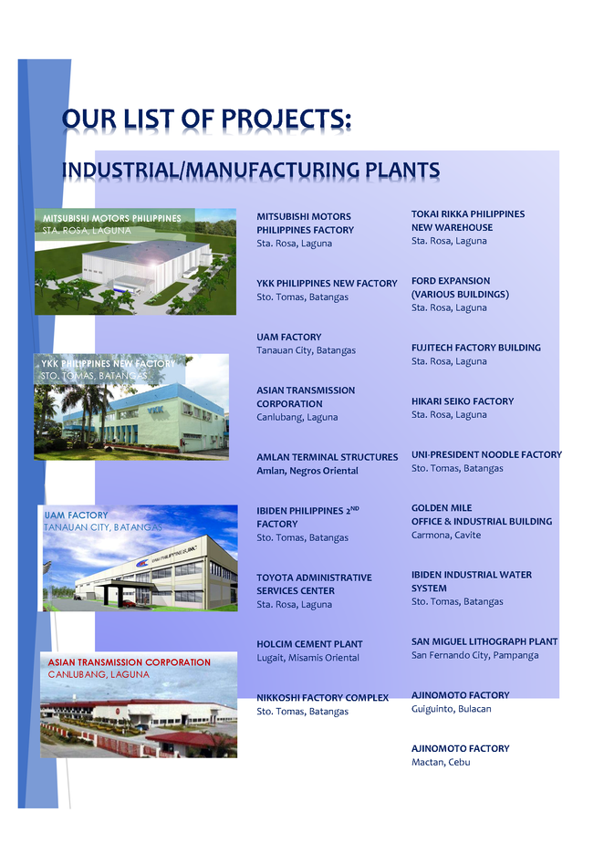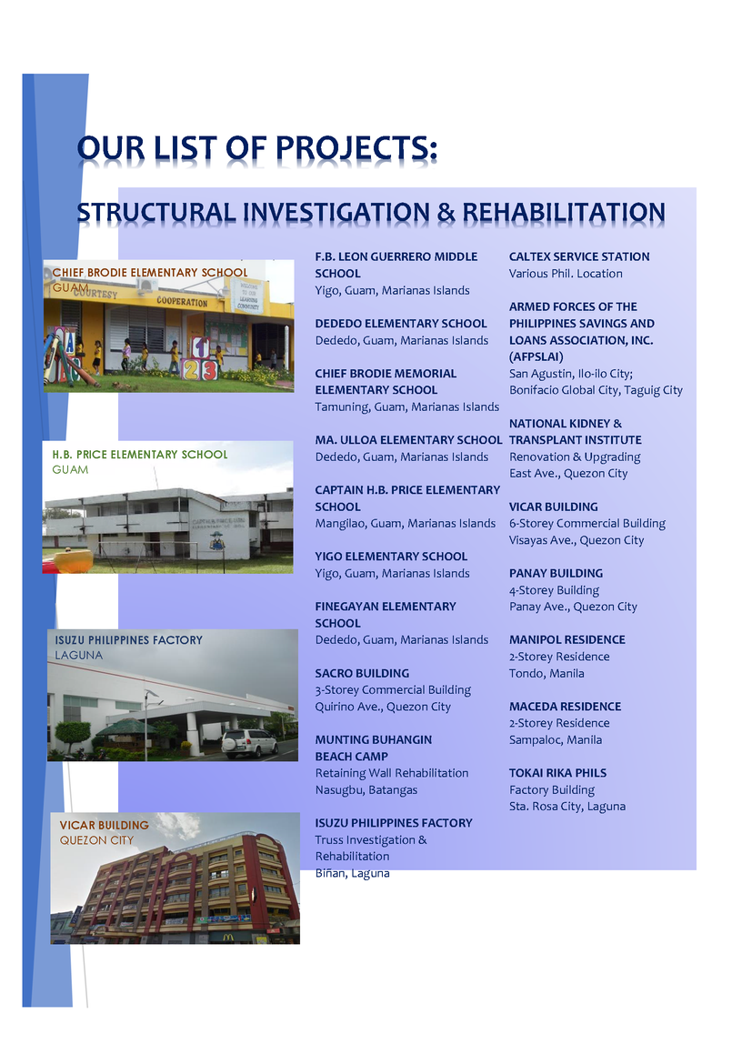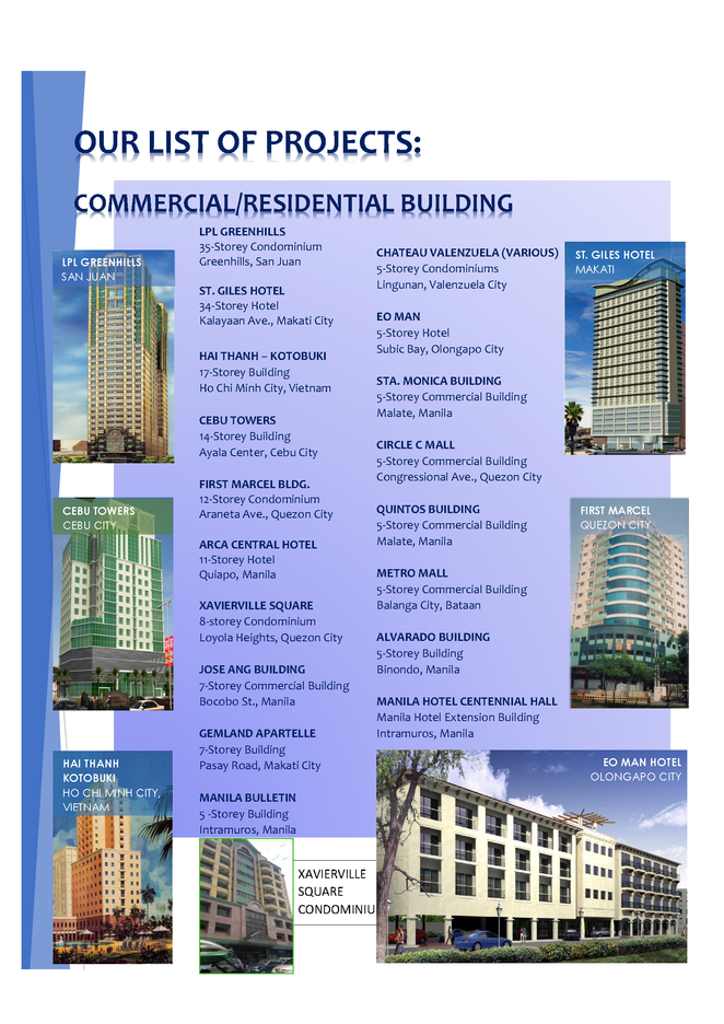 The firm is well versed not only in local design codes but also with international standards as well, since we have done projects in other countries such as Japan, Thailand, Guam, Saipan, Indonesia, Vietnam, Nigeria, Angola and the Middle East.